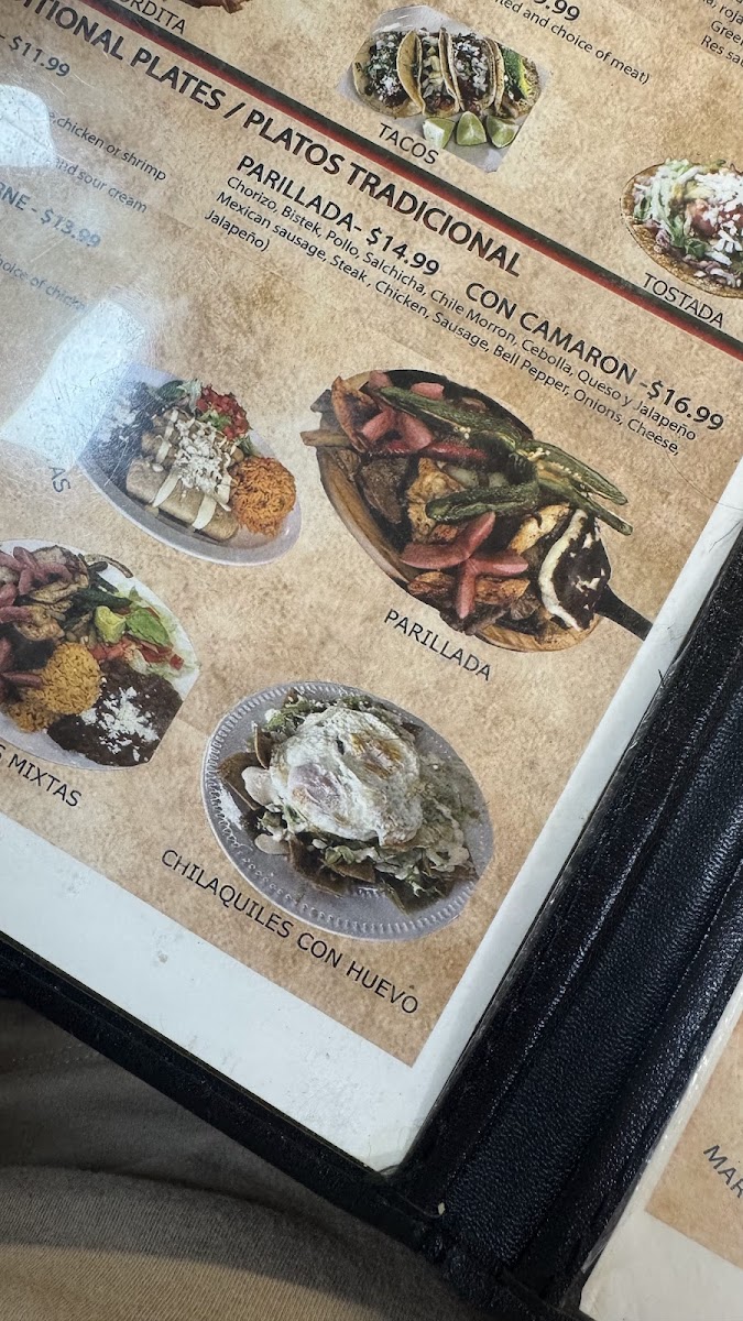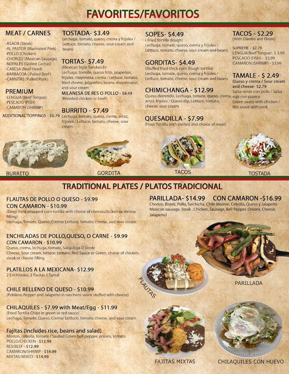 Fried tortilla chips in green or red sauce. Lechuga, tomate, queso, crema and lettuce, tomato, cheese, and sour cream.