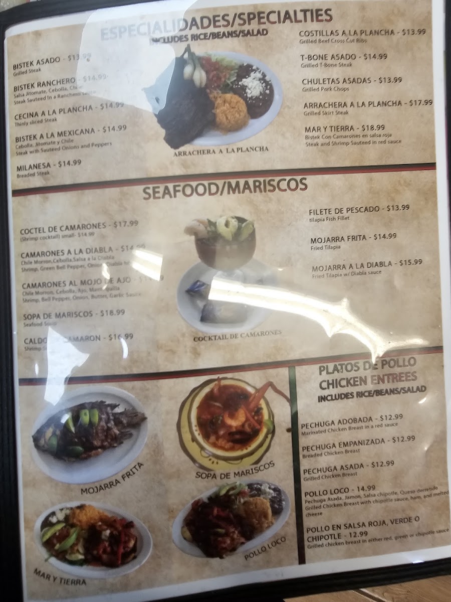 Steak and shrimp sauteed in red sauce (bistec con camarones en salsa roja). Includes a side of rice, beans, and salad.